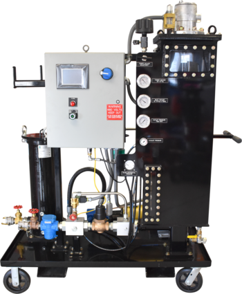 The purpose of the FD-15 Vacuum Dehydration System is to serve as an oil treatment system. By removing water (dissolved, emulsified and free), gasses and solid contaminants the oil can return to its original condition, and be reused in lubricating systems. Having clean, dry oil will allow hydraulic and lubricating systems to perform more efficiently and can result in significant financial gains. The need to purchase new lubricating oils can be reduced and in some cases eliminated completely.